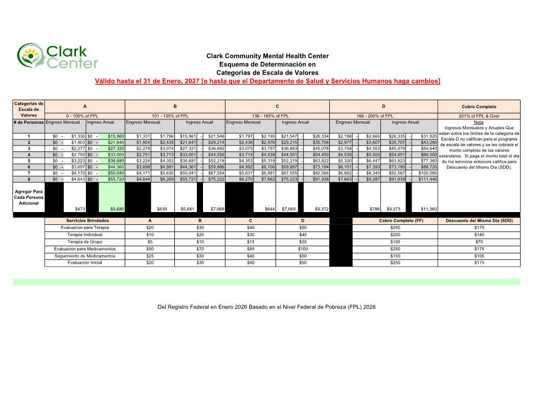 El Clark Center acepta Medicaid, Medicare y varios seguros privados. Las personas que no tienen cobertura de seguro de salud o que son inadecuadas pueden beneficiarse de la asistencia financiada por el Estado, lo que puede significar que estos clientes no deberán nada por los servicios. Cuando la asistencia financiada por el Estado no esté disponible, a estas personas se les ofrecerá una tarifa variable.